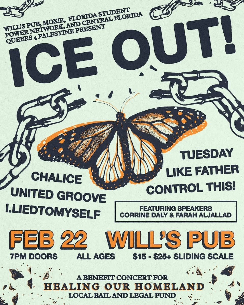 Will's pub, MOX!E, Florida Student Power Network, and Central Florida Queers 4 Palestine present...ICE OUT! A Benefit Concert Donations to benefit Healing Our Homeland local bail and legal fundFeaturing music by...LIKE FATHERCONTROL THIS!I.LIEDTOMYSELFCHALICEUNITED GROOVETUESDAYand talks by Corrine Daly & Farah Aljallad Sunday, February 22nd, 2026 Will's Pub1042 N Mills Avenue 7PM Doors | 7:30PM Speakers | 8PM Music Tickets: $15 -$25 plus |Tickets are sliding scale /pay what you can afford. All proceeds to benefitHealing Our Homeland local bail and legal fund Tickets are on sale online and at the door day-of show